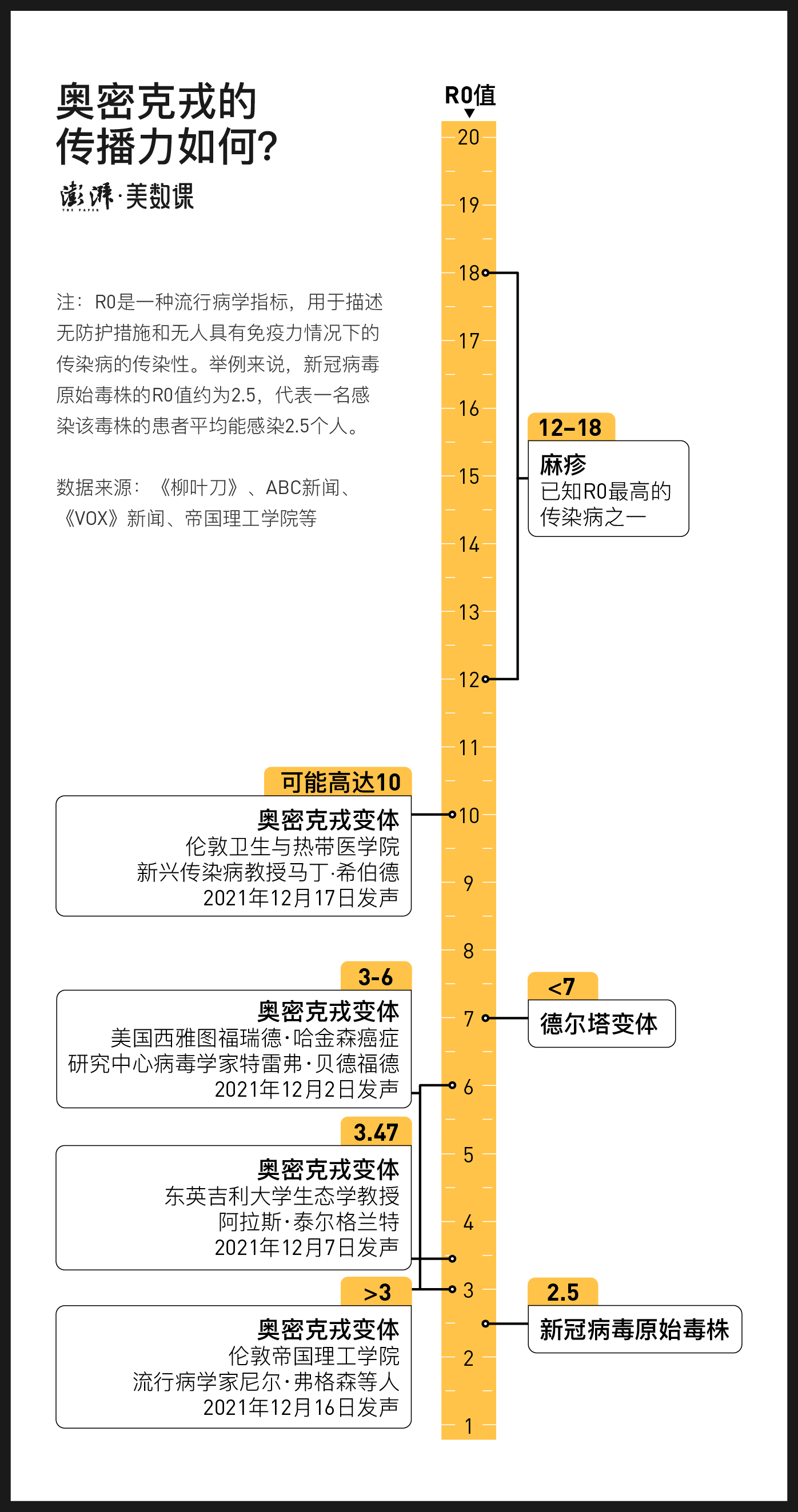 由于当下数据有限,奥密克戎传播力仍无定论。12月2日,美国西雅图福瑞德·哈金森癌症研究中心病毒学家特雷弗·贝德福德在社交平台上称,奥密克戎的R0值在3至6之间;伦敦帝国理工学院流行病学家尼尔·弗格森等人在12月16日发表的一篇论文中表示,该数值可能大于3。也有预测更高的R0值,据英国医学杂志《柳叶刀》,伦敦卫生与热带医学院新兴传染病教授马丁·希伯德认为,奥密克戎的R0值可能高达10。