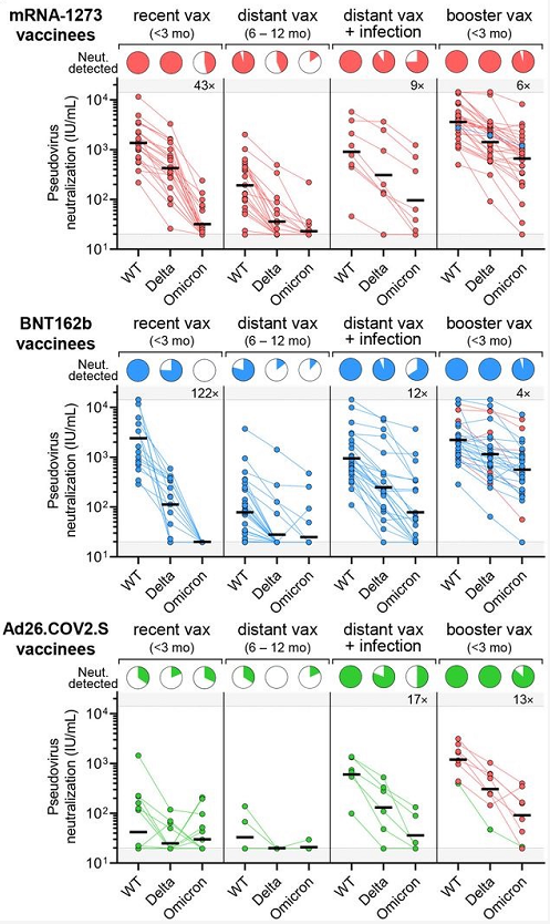 接受mRNA-1273(上图;红色)、BNT162b2(中图;蓝色)或Ad26.COV2.S(下图;绿色)系列疫苗接种的人对野生型(WT)、德尔塔和奥密克戎假病毒的中和滴度(以WHO IU/mL为单位)进行测定。三组迷你图中的四个分图,从左至右分别表示于最近3个月内接种、最近6至12个月接种、曾被感染且在最近6至12个月接种,以及在最近3个月内打过加强针的情况;每组的深色横线表示几何平均滴度。饼状图显示了每组中可检测到中性的疫苗接种者的比例。相对于野生型,Omicron的几何平均中和滴度下降的倍数显示为灰色区域内带有“×”符号的数字。