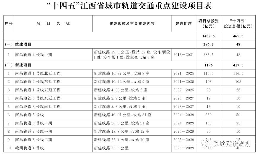 规划建设大南昌都市圈市域(郊)铁路,适时启动南昌至抚州、南昌至德安、南昌至安义市域(郊)铁路建设,建成南昌轨道交通4号线及1、2号线延伸线,推进南昌轨道交通第三期建设规划的申报及开工建设,加快形成大南昌都市圈多层次轨道交通网络。建成南昌绕城西二环、抚州东临环城等高速公路建设,开工建设瑞昌至武宁、阳新至武宁至樟树、彭泽至东乡等高速公路,推进景德镇至鄱阳至南昌等高速公路规划研究,加强都市圈城际公路建设,积极推进三清山大道南延对接丰厚一级公路工程、赣新大道等项目建设,加快形成大南昌都市圈连接东西、贯通南北、内畅外联的“两环九射线”综合运输通道,基本建成以南昌市中心城区和赣江新区为核心的多层次、放射状、强联通的综合交通网。