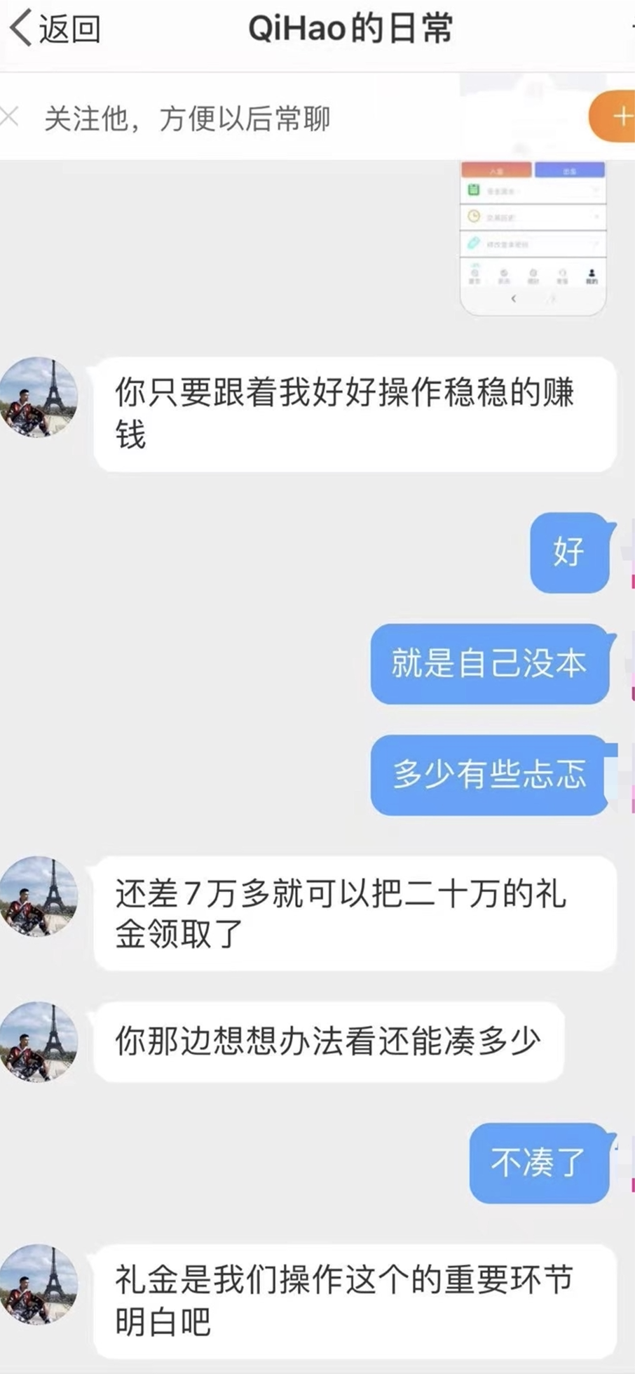 今年32岁的梁萍(化名)是一名体育教练,由于怀孕不得不减少工作。今年10月7日,一名微博名为“QiHao的日常”的男士频繁私信她,“他经常关心我,我刚好没什么事,就聊了一下,对方会和我聊一些旅游、创业、家庭之类的话题,感觉很能站在我的角度去理解我,还知道我所在地方的风土人情,让人感觉很真实。”
