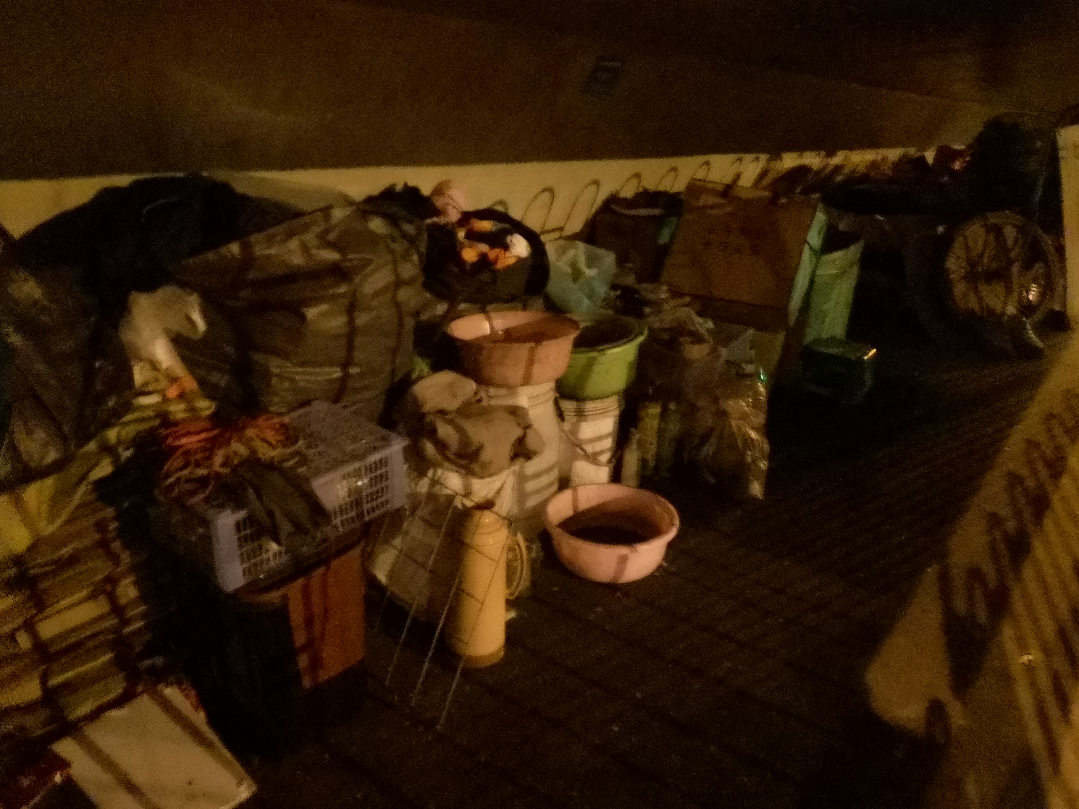 当晚8点40分,长宁区延安西路刘海粟美术馆对面的高架桥下,在一个角落里,记者看到堆放着脸盆、水瓶、小板凳、大袋子等生活用品,不过当时已无人在此。