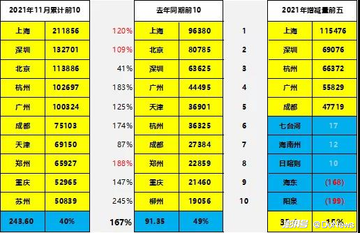 据乘联会数据,今年前11个月,新能源车销量前10名的城市中,增幅前3名的城市分别是苏州(245%)、郑州(188%)、杭州(183%),除了杭州都是非限购城市。而且,非限购的成都,也在总量上超过了限购的天津。