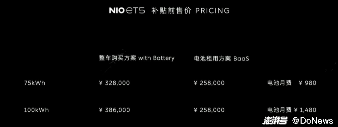这还没算蔚来的Bass方案,如果采用该模式,那么蔚来ET5的起售价仅为25.8万元。那么Bass方案是否划算呢? 具体来看,蔚来75度电池和100度电池的年租金分别为11760元17760元。如果用小电池(NEDC续航550km),那么大概7年以后,其总费用(购车+电池租金)会与特斯拉Model 3/小鹏P7的双电机入门版车型相当。用大电池(NEDC续航700km),这个时间则是4年半。这么看来,用车周期和续航,似乎只能二选一。