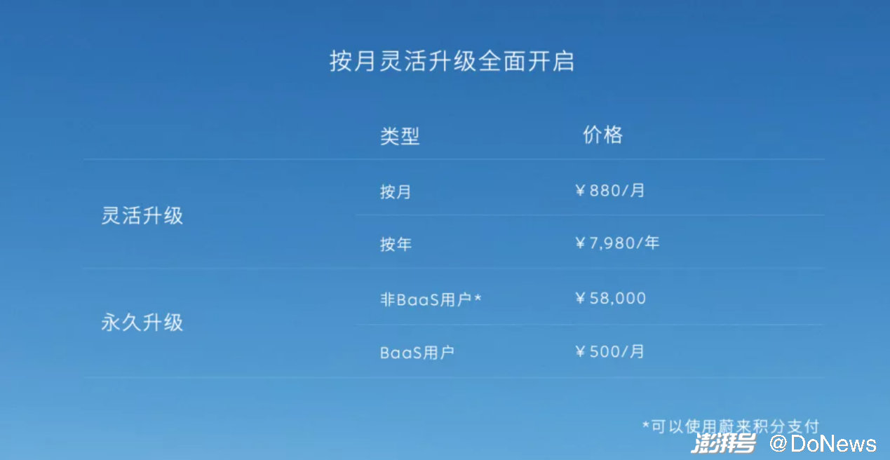 不过,蔚来也早就考虑到了这点,故在本月初推出了电池灵活升级服务。小电池换大电池,包月费用是880元,包年费用是7980元。