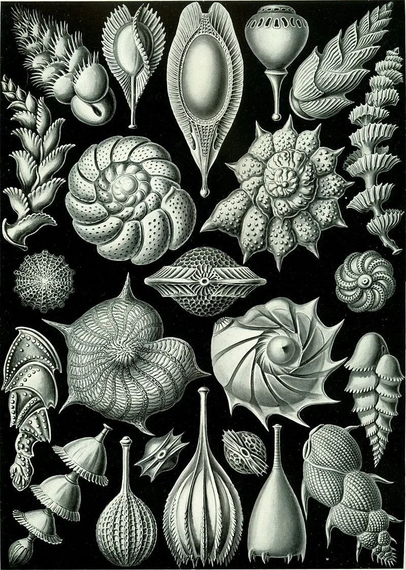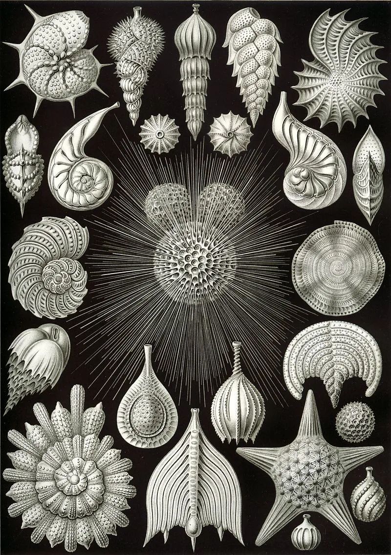 有孔虫的科学绘画,生物学家海克尔(Ernst Haeckel)绘制 | Wikimedia Commons“有壳”的单细胞生物