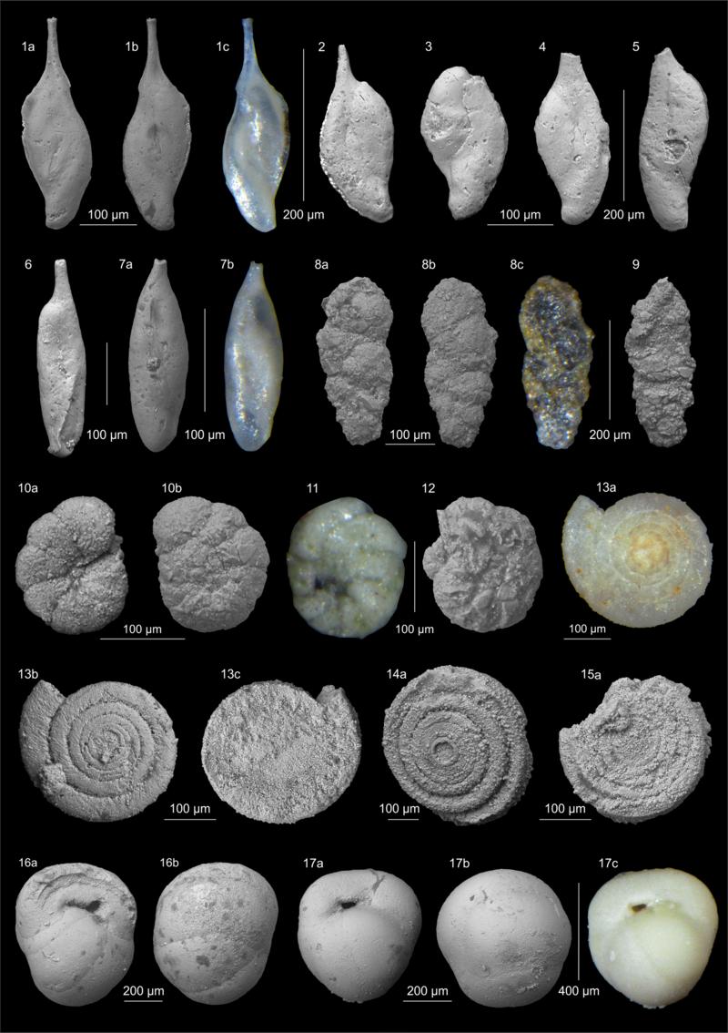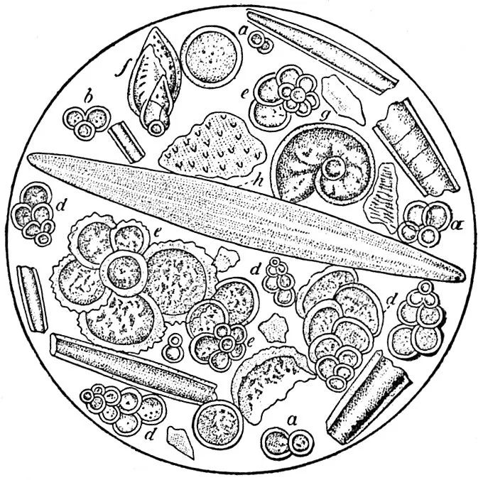 科学绘画,石灰岩中各种微小的生物残骸 | Wikimedia Commons有孔虫化石也是研究古气候,古生态的重要指示物种,在深海钻探的岩芯中发现的有孔虫化石,对其数量和种类的统计,为人类了解数千万年前的古代海洋,提供了一扇不可多得的窗口。