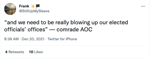 12月20日,有网友@StillUpMySleeve在推特上“引述”美国民主党议员亚历山德里娅·奥卡西奥-科尔特斯(Alexandria Ocasio-Cortez,AOC)的话:“我们真的需要炸掉我们当选官员的办公室。”