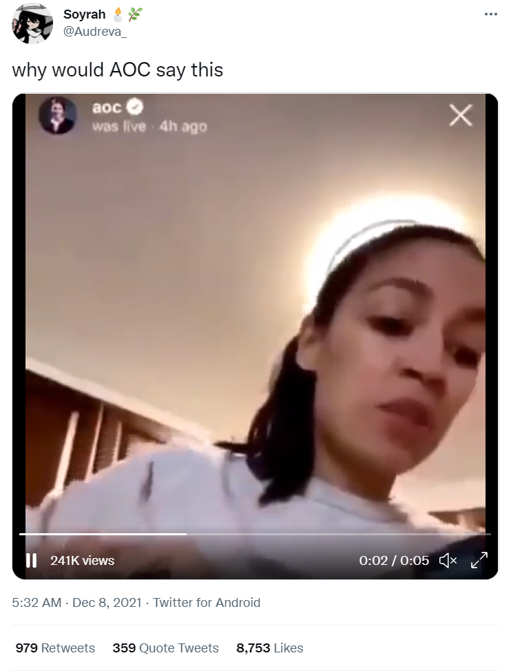 在推特上将时间限定在2021年12月20日之前,限定格式为“视频”,搜索关键词“AOC”后发现,此前,有网友放出一段她在社交媒体照片墙(Instagram)上的直播视频。视频中,AOC一边调制鸡尾酒,一边用轻松的语气说着要“炸掉(blowing up)当选官员的办公室”。网传消息似乎并非空穴来风,而是基于这段视频进行了转述。但值得注意的是,该视频时长只有5秒,且缺少前后语境,有恶意剪辑、断章取义之嫌。