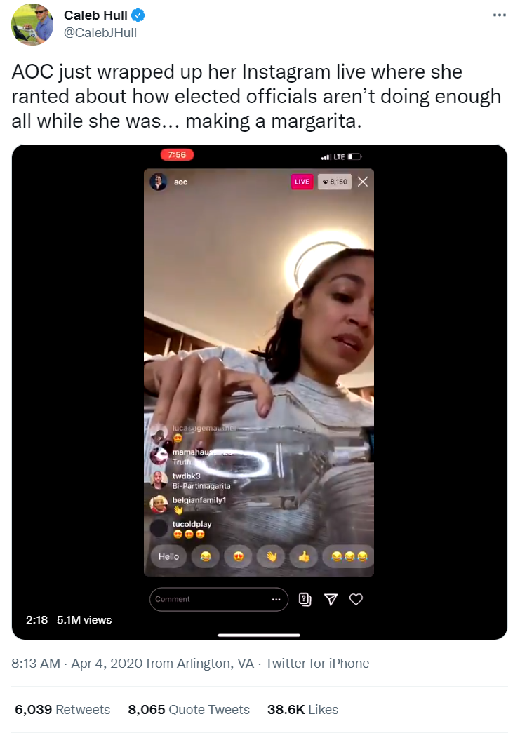 经核查后发现,去年4月,有一名为@CalebJHull的用户上传了这张直播的手机录屏版本,收获了将近4万点赞。在配文中,@CalebJHull写道:“AOC刚刚结束了她在Instagram上的直播,她咆哮着说当选官员做得不够好,而她却在……调制玛格丽特酒。”整段文字充满了讽刺和批评的意味。