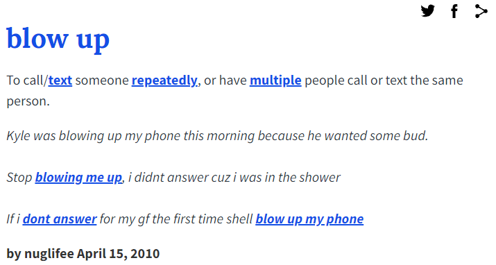 在英语俚语词典Urban Dictionary中搜索短语“blow up”可以发现,除了常用的“爆炸、使爆炸”词义外,blow up还有多种含义,包括“短时间内获得名声、金钱”,以及“给某人不断打电话/发短信,或者很多人给一个人打电话/发短信”。这种用法又类似于中文中的“打爆电话”、“短信轰炸”。