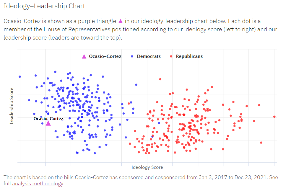govtrack.us网站结合2021年12月23日之前的提案和投票,对AOC的政治意识形态和领导力进行了可视化,横轴表示意识形态得分,纵轴代表领导力得分。