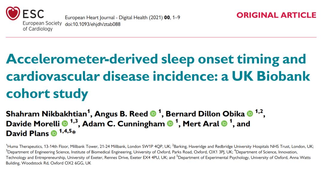 2021年11月9日,英国Huma医疗公司的研究人员在欧洲心脏病学会(ESC)旗下期刊 European Heart Journal-Digital Health 上发表了题为:Accelerometer-derived sleep onset timing and cardiovascular disease incidence: a UK Biobank cohort study 的研究论文。