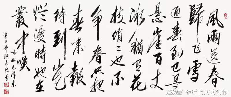 如果继光叔没有对人文意识的洞见,他的书法就没有那种笃实静谧的境界;如果继光叔没有对古典艺术的敬畏,他的作品就没有那种清逸超群的洒脱。比如他的这幅作品,书自毛泽东的《卜算子·咏梅》: