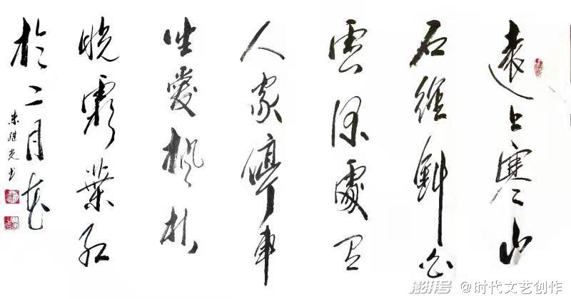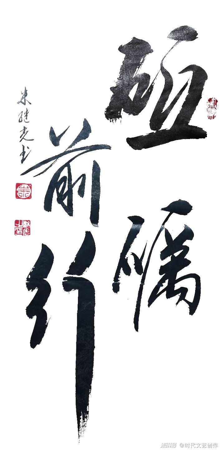 而这幅《砥砺前行》,观之让人雀跃,从中亦可细品其点染、笔墨、结构、章法,无不彰显出丰富的内涵、飞扬的神采、明快的情愫,更可以体会到继光叔曾为军人昂扬向上的精神气质。其作品不但苍劲潇洒、点画沉厚,而且结字茂密,姿态奇宕,竖挺方折,形成了落笔酣畅、点画遒劲,字形优美的艺术风格。纵观其笔墨线条,别具一番刀笔相融、古今贯通之趣。