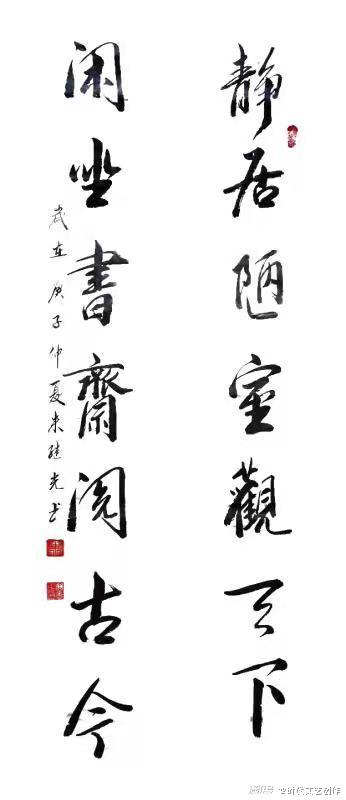 这幅作品,展现了继光叔书法的另一面。在此幅作品中,其线条笔势雄强,瘦劲纤细,刚柔相济,点画明快,既有碑学提倡的厚实凝重,又有帖学推崇的流畅绵长。其线条既圆又细,有细节的维度,更有悦动之感,绝无浮躁以技炫人而少内蕴的做作,更多的是谦朴沉毅、风神内敛,是不经意的雄而不群、苍而守凝。笔墨功夫沉实有力,极具力量感、节奏感、立体感。