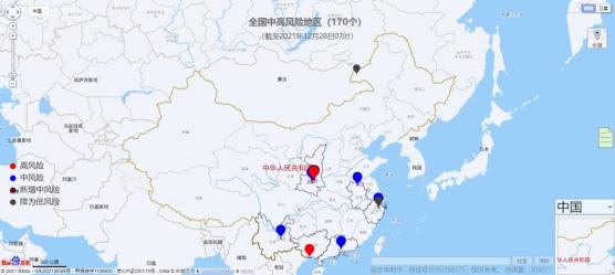 截止2021年12月28日10时:全国共有高风险地区2个,其中西安市1个,广西壮族自治区防城港东兴市1个。中风险地区168个,其中浙江省绍兴市5个;陕西省西安市150个;安徽省宿州市1个;广东省东莞市10个;广西壮族自治区防城港1个;云南省昆明市1个。具体如下: