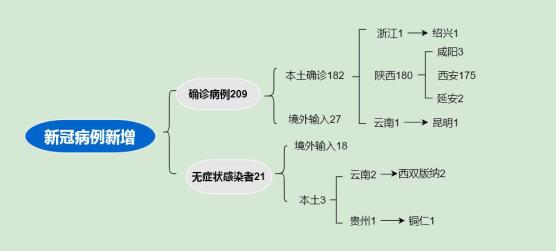 12月27日0—24时,31个省(自治区、直辖市)和新疆生产建设兵团报告新增确诊病例209例。其中境外输入病例27例(上海8例,广西6例,福建2例,山东2例,广东2例,云南2例,陕西2例,天津1例,浙江1例,重庆1例);本土病例182例(陕西180例,其中西安市175例、咸阳市3例、延安市2例;浙江1例,在绍兴市;云南1例,在昆明市)。无新增死亡病例。无新增疑似病例。当日新增治愈出院病例92例,解除医学观察的密切接触者2436人,重症病例较前一日减少1例。