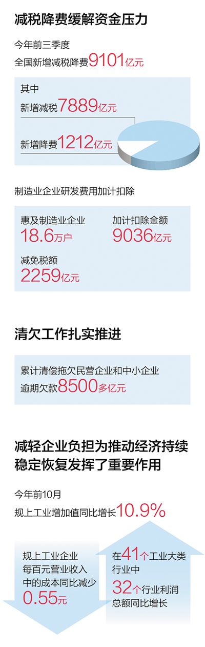 今年前三季度,全国新增减税降费9101亿元;截至10月底,全国市场监管部门共检查收费单位6.5万家,退还企业24.6亿元……最近,企业“减负”成绩单公布,一项项政策举措聚焦助企纾困,有力增强了市场主体发展信心。