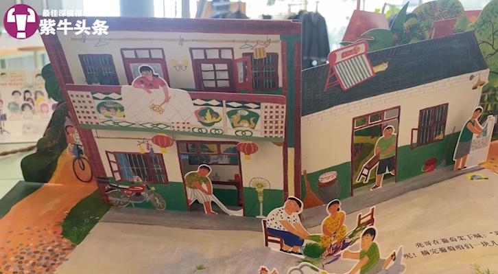 谭星祺和她创作的《咬秋》“这是我当时在爷爷奶奶的房间里睡觉,睡在老式凉床上的样子。”记者看到,书本里设计了老式的房间,里面摆放了很多老物件。“第二页还原了我跟着爷爷去集市上买肉的场景,第三页讲述了我们一家人在家门口摘菜、洗鱼、摘葡萄、打枣,准备迎接客人的画面。”记者看到,书里的每一页都设计了精巧的“机关”,不仅立体而且活灵活现。最有意思的是一页采菱角的画面,书页展开后形成了池塘中的“水平面”:一半在水上、一半在水下,人物乘着木桶在池塘中采菱角,“这是我特别想要记录下来的画面,当时奶奶真的教会了我坐着木盆采菱角,非常难忘。”