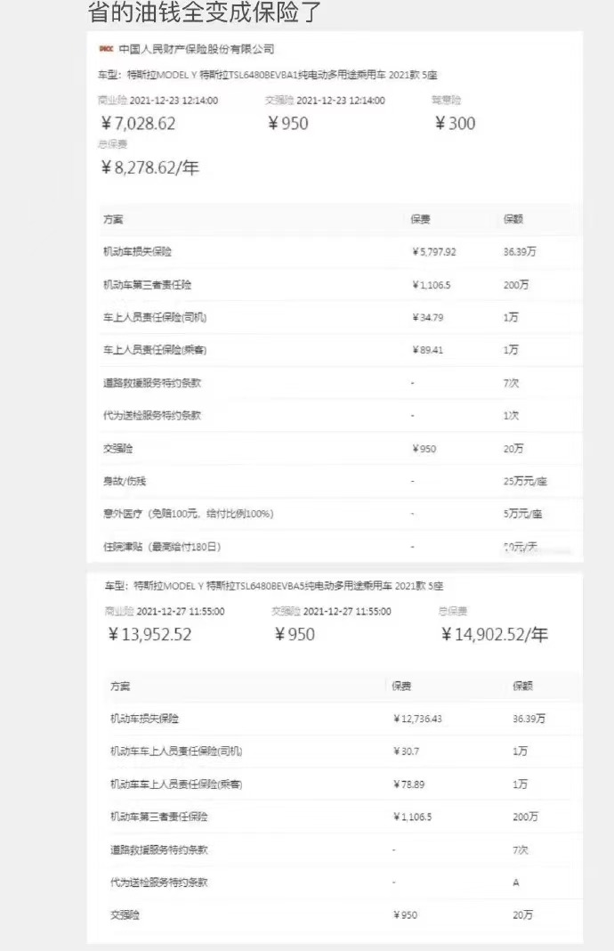 网传Model Y新车保费从8278元涨至14902元,来源:网络