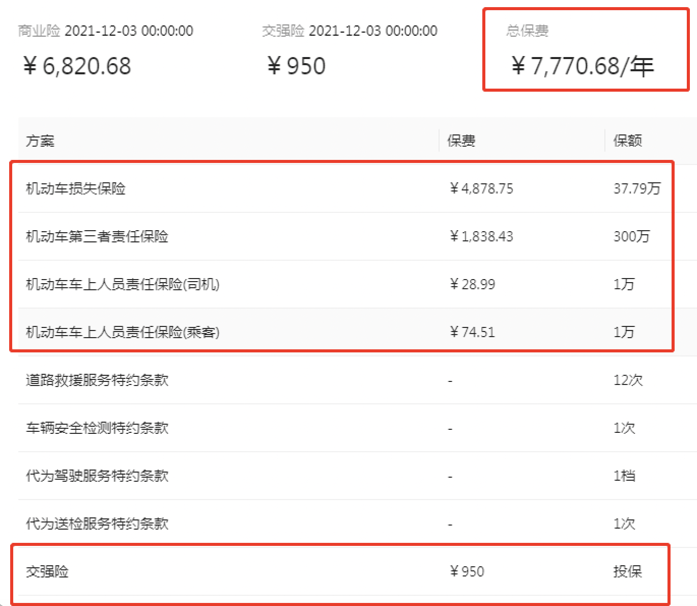 据介绍,以售价为38.79万元的特斯拉Model Y高性能版为例,若该车型购买工作人员所称的“全面款保险”,即包含车损险、300万元档三者险、司机座位险、乘客座位险、交强险共计5个险种,总金额约为10827元。