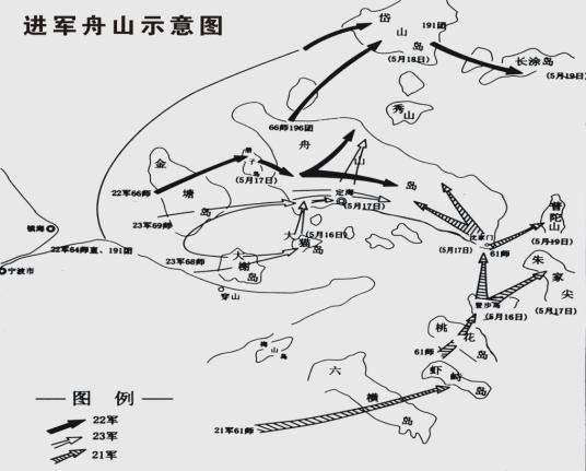 1950年5月16日晚,当得知敌军败退后,解放军兵分三路进军舟山。17日,21军解放登步岛和沈家门,22军解放册子岛和岑港,23军解放定海城区。到19日解放全境,舟山战役胜利结束。