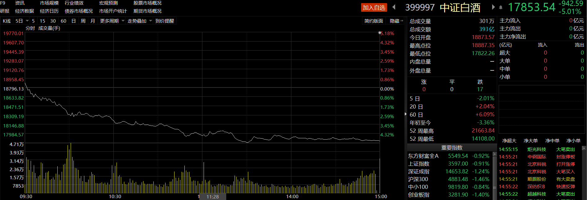 A股年度总成交额刷历史新高,但今日指数表现不佳。从盘面上看,白酒板块成为重灾区,“白酒基金”话题登上微博热搜。