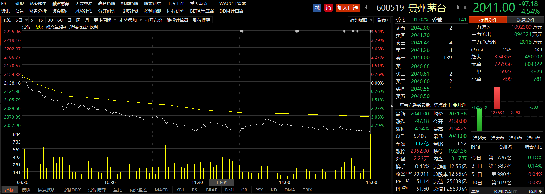 在个股方面,贵州茅台今日股价大跌4.54%,收盘报价2041元/股,成交额112亿元,最新市值25639亿元。
