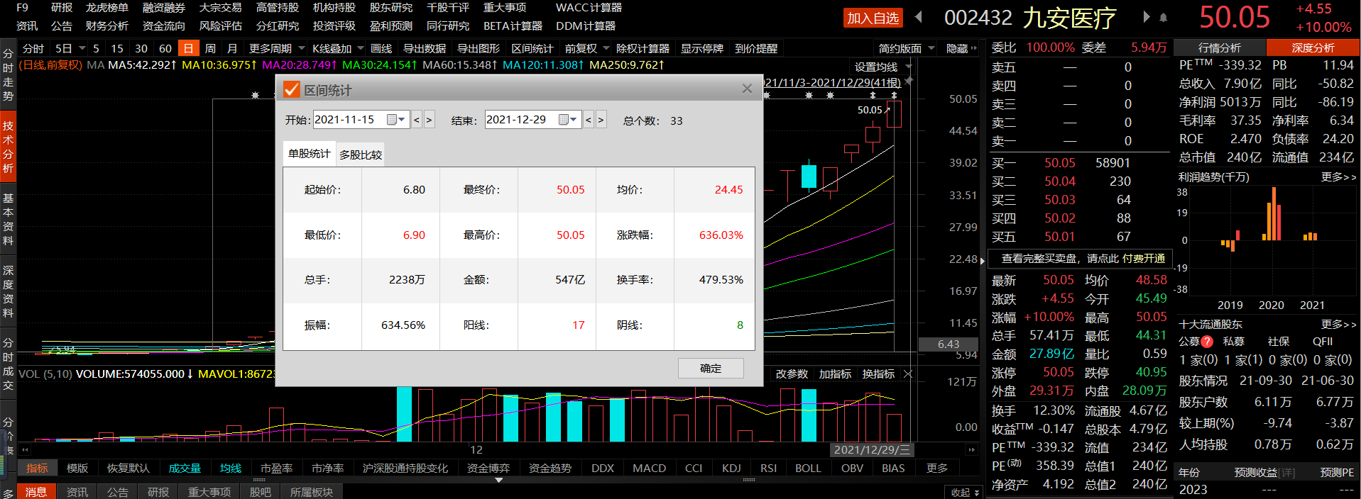 值得关注的是,九安医疗在今日实现了2个月以来的第22个涨停。东方财富Choice数据显示,在11月11日至今的33个交易日内,九安医疗狂涨636.03%,从最低的6.9元/股涨到了如今的50.05元/股,股价涨了逾6倍。