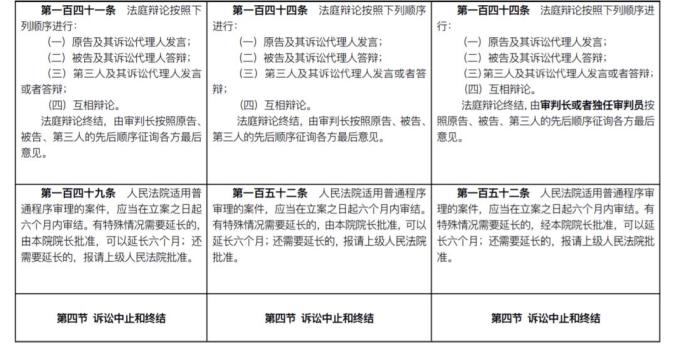 十六、将第十三条中的“诚实信用”修改为“诚信”;将第四十六条、第一百三十七条、第一百四十一条中的“审判长”修改为“审判长或者独任审判员”;将第八十二条中的“节假日”修改为“法定休假日”;将第一百零六条、第一百五十一条、第二百零六条、第二百五十七条中的“抚育费”修改为“抚养费”;将第一百二十八条中的“合议庭组成人员”修改为“审判人员”;将第一百四十九条中的“由本院院长批准”修改为“经本院院长批准”;将第一百八十四条、第一百八十五条中的“意外事故”修改为“意外事件”;将第一百八十七条中的“其近亲属或者其他利害关系人”修改为“利害关系人或者有关组织”;将第一百九十条中的“或者他的监护人”修改为“本人、利害关系人或者有关组织”;将第一百九十三条中的“民法通则”修改为“民法典”;将第一百九十六条中的“物权法”修改为“民法典”;将第二百三十九条中的“从规定的每次履行期间的最后一日起计算”修改为“从最后一期履行期限届满之日起计算”。