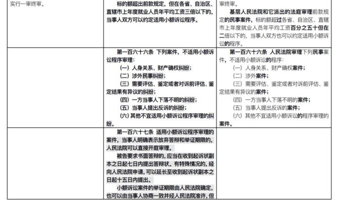 九、将第一百六十二条改为第一百六十五条,修改为:“基层人民法院和它派出的法庭审理事实清楚、权利义务关系明确、争议不大的简单金钱给付民事案件,标的额为各省、自治区、直辖市上年度就业人员年平均工资百分之五十以下的,适用小额诉讼的程序审理,实行一审终审。