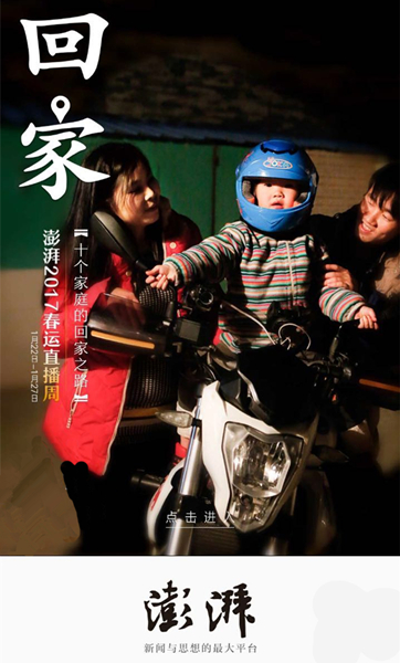 澎湃新闻“回家·2017春运直播周”已于1月22日正式启动,全程直播10个家庭通过摩托车、高铁、大巴等方式返乡之路。