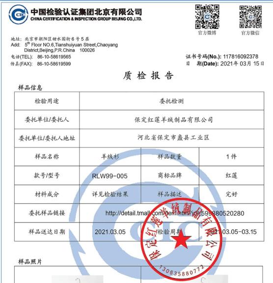▲实拍。羊绒市场鱼龙混杂,甚至有些纯化纤的,手感做得软绵,也敢说自己是羊绒。红莲羊绒衫吊牌上注明,100%山羊绒制作,真正好材质辽婶儿为你找到