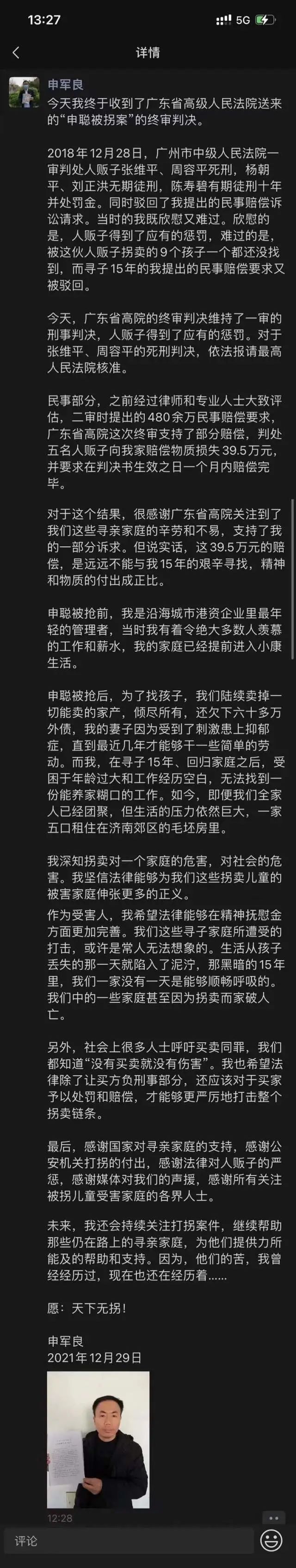 12月29日,申军良向南方+记者表示,对判决结果感到欣慰,被告人得到了应有的惩罚,同时他还对广东省高院关注到寻亲家庭的辛劳和不易、支持了一部分民事诉求表示感谢,“但说实话,39.5万元的赔偿,是远远不能与我15年艰辛寻找所付出的成正比。”