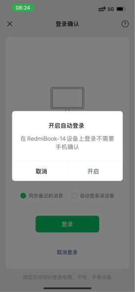登录 Windows / macOS 微信后,在手机端的微信中,点击“微信已登录”条幅,在出现的页面中,会新增显示“自动登录该设备”选项,用户只需要打勾即可。此外,“自动登录”可以在手机端打开或者关闭,在 PC 端,仅有关闭选项。PC 端设置页面显示:“开启后,在本机登录微信将无需手机确认,可在手机和电脑上关闭。”