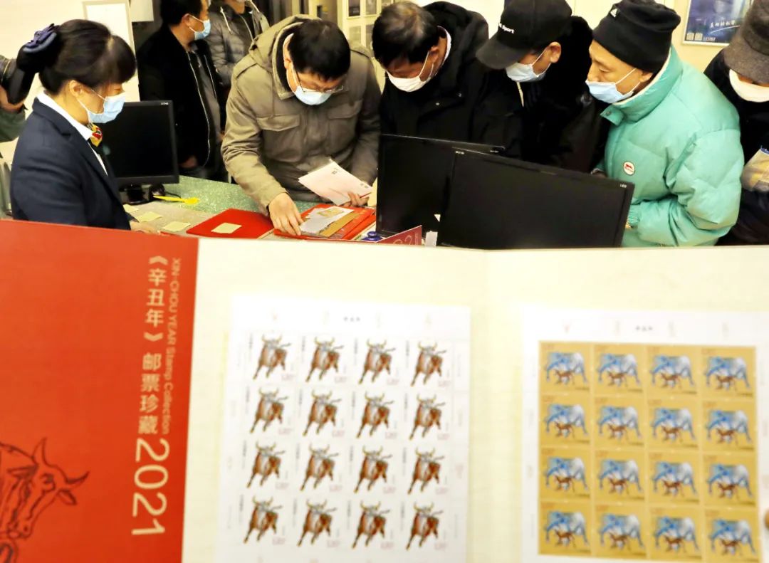 2021年1月5日中国邮政金山石化邮政支局营业大厅,集邮爱好者排队购买《辛丑年》生肖特种邮票