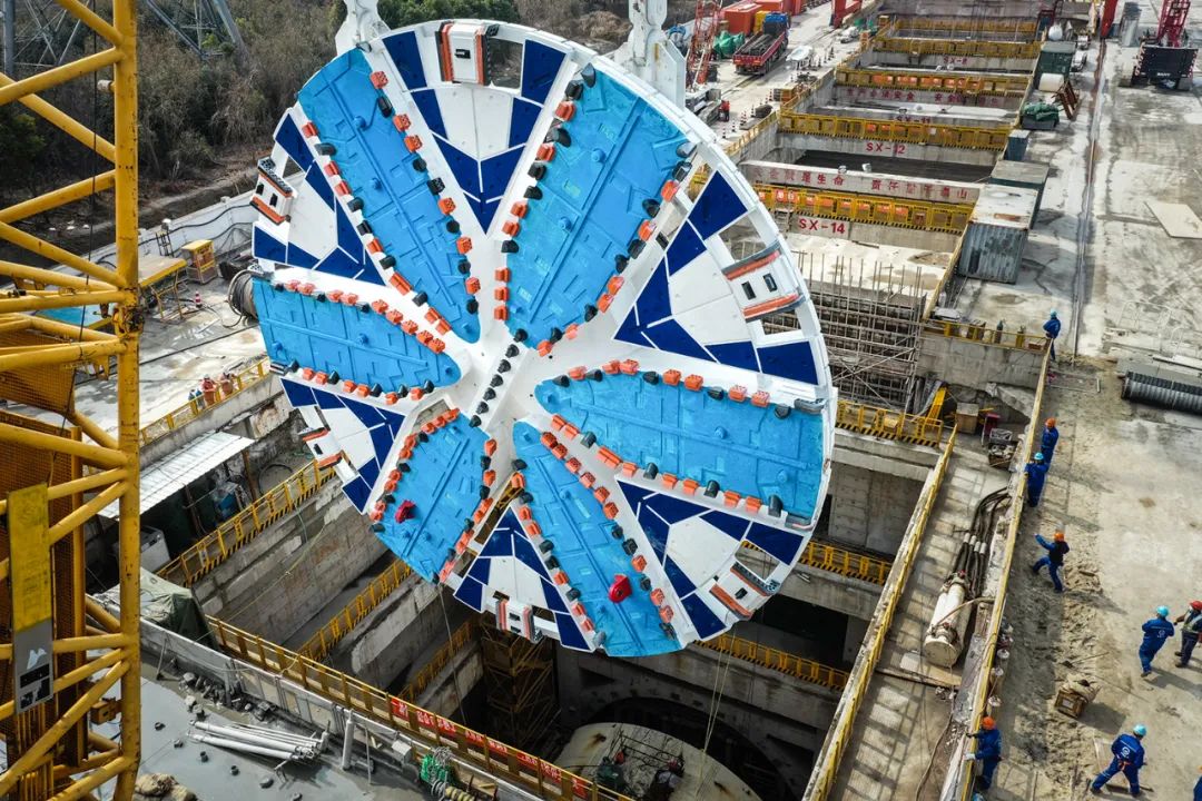 2021年1月27日国产超大直径盾构“骐跃号”在上海市域铁路机场联络线3标梅富路工作井吊装刀盘