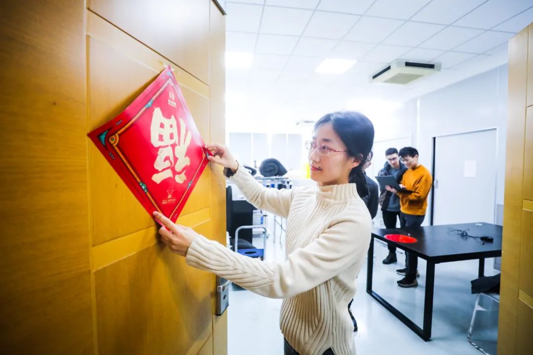 2021年2月2日寒假中,上海交通大学约有2000名学生留校过春节,是往年人数的近十倍。图为家在辽宁的博士研究生赵同学将“福”字贴在实验室门上,平添了一份节日气息