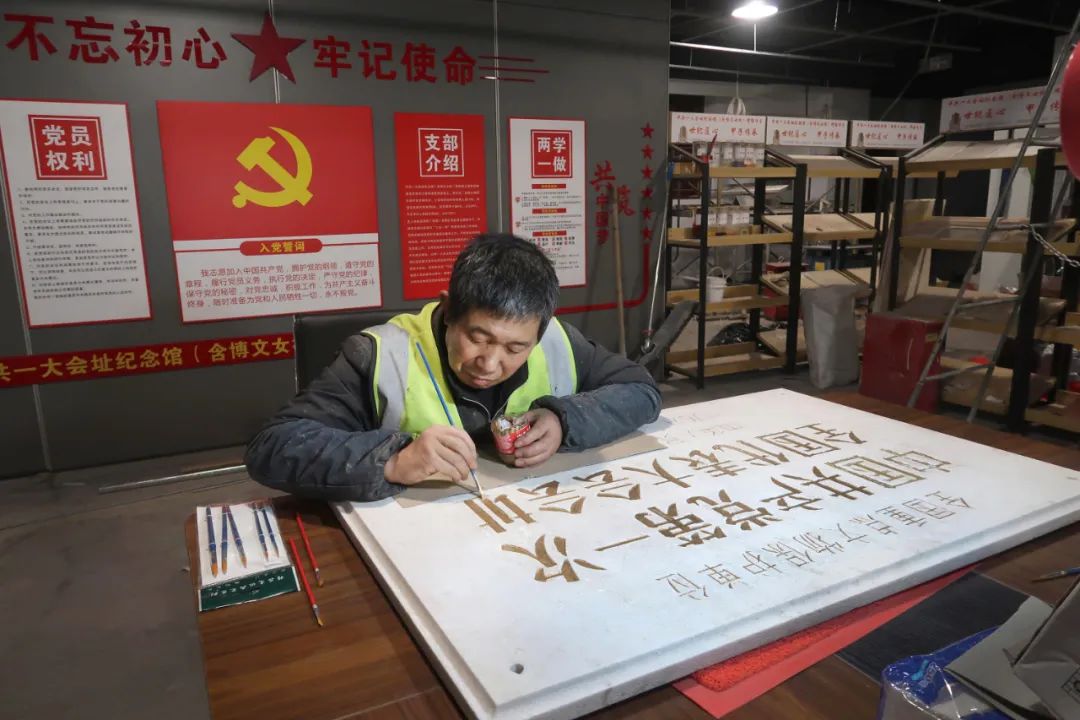 2021年3月12日参与修缮施工的徐师傅,正在为中共一大会址“全国重点文物保护单位”标志铭牌补漆描金