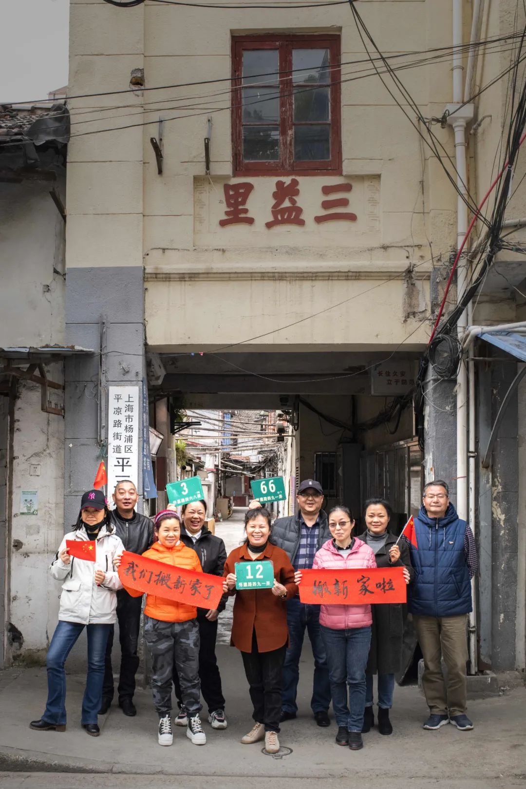 2021年4月14日杨浦区三益里旧改如期完成,居民和志愿者在弄堂口留影纪念