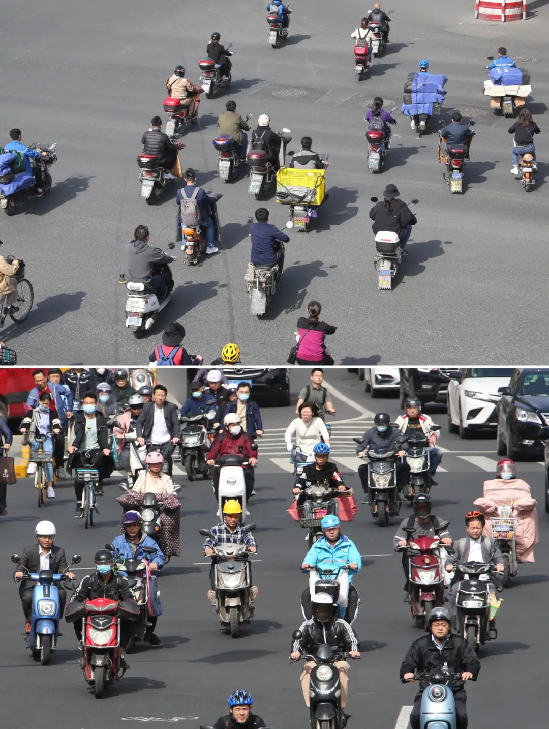 2021年4月30日——5月1日《上海市非机动车安全管理条例》正式实施,《条例》对驾驶行为提出更高要求,新增驾乘电动自行车时均应佩戴安全头盔等新规。图为《条例》执行前后对比,市民头盔佩戴率明显提升
