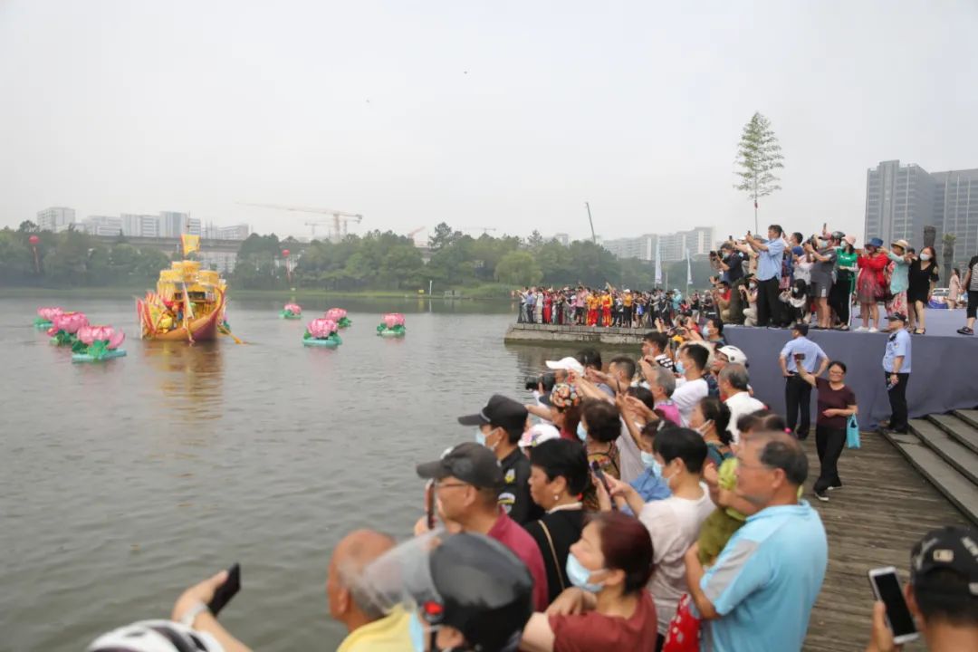 2021年6月11日宝山罗店龙船文化节在美兰湖举行,特色龙船表演吸引市民纷纷留影