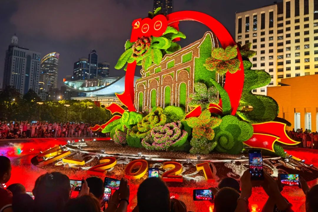 2021年7月1日位于人民广场的庆祝建党100周年主题花坛吸引众多市民观看