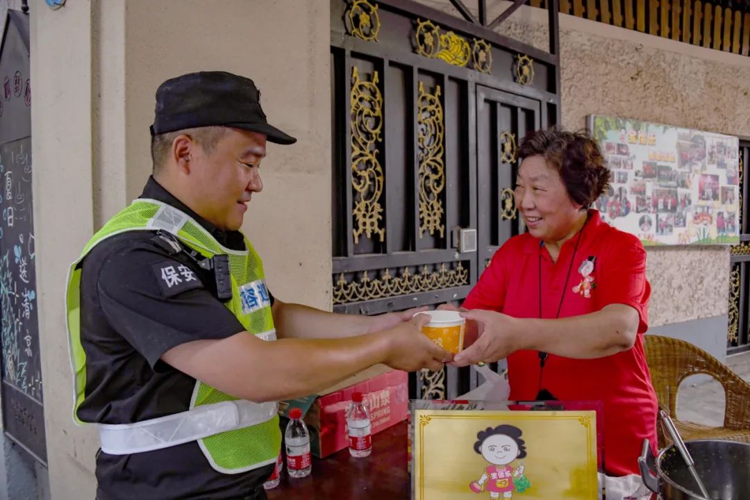 2021年7月15日徐汇区天平街道“宝怡乐”团队的阿姨爷叔们,在永嘉路490号弄堂口摆起一年一度的清凉摊,为户外工作人员送上清热解暑的绿豆汤