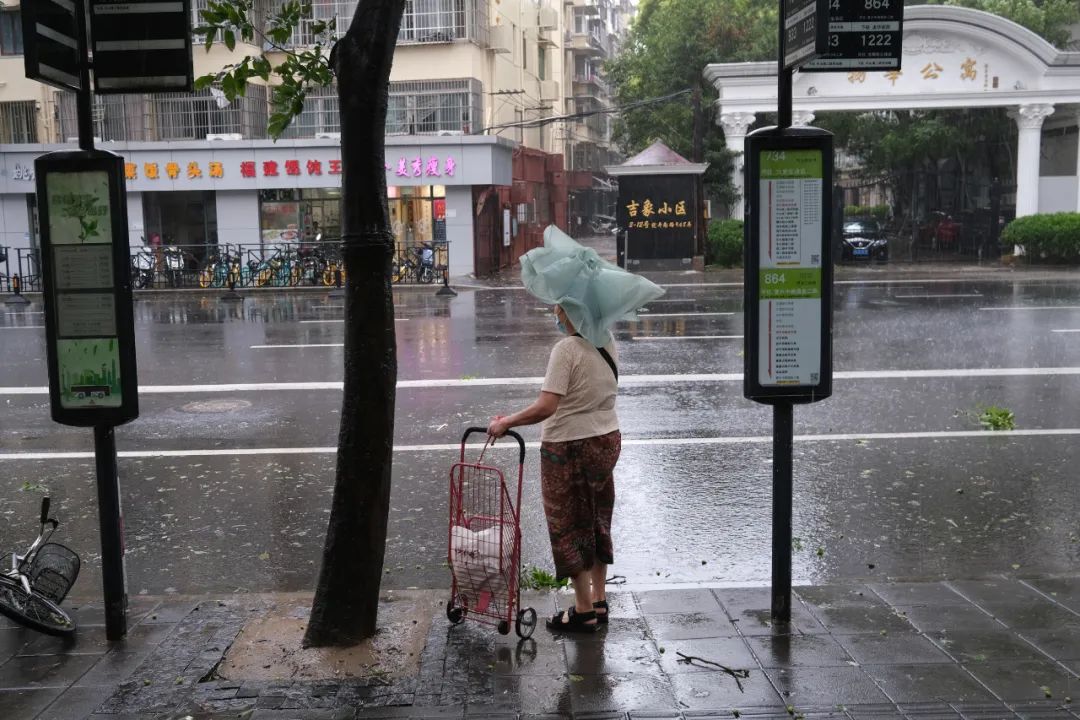 2021年7月25日台风中的街头即景,一位候车的市民用半开的雨伞勉强遮挡着风雨