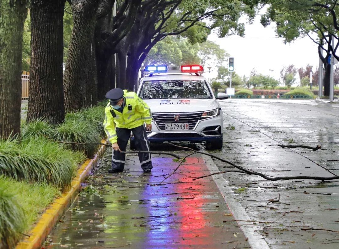 2021年7月26日台风“烟花”过境上海。在金山石化大堤路,一位巡逻民警在捡拾被大风吹落的树枝,确保道路畅通