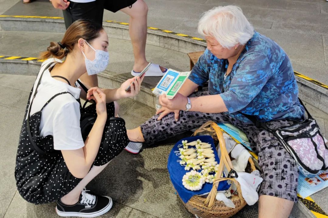 2021年7月31日徐家汇美罗城门口售卖栀子花白兰花的老阿婆跟随时代潮流,接受移动支付