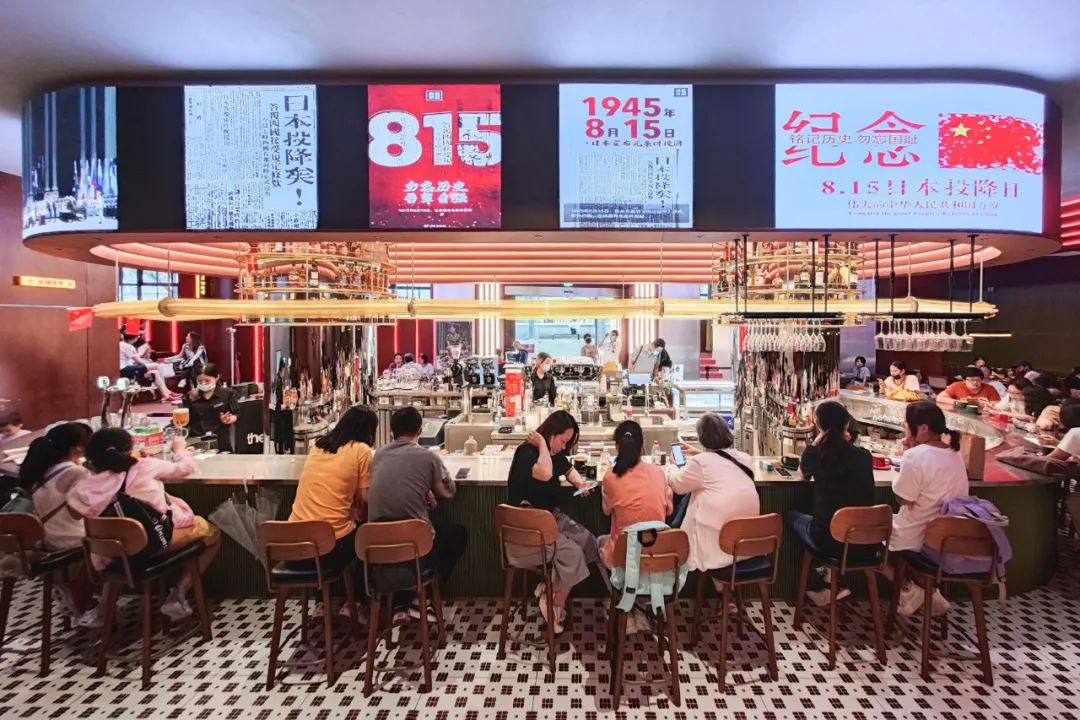 2021年8月15日日本投降纪念日,四行仓库内的人民咖啡馆,大屏滚动播放纪念日宣传海报