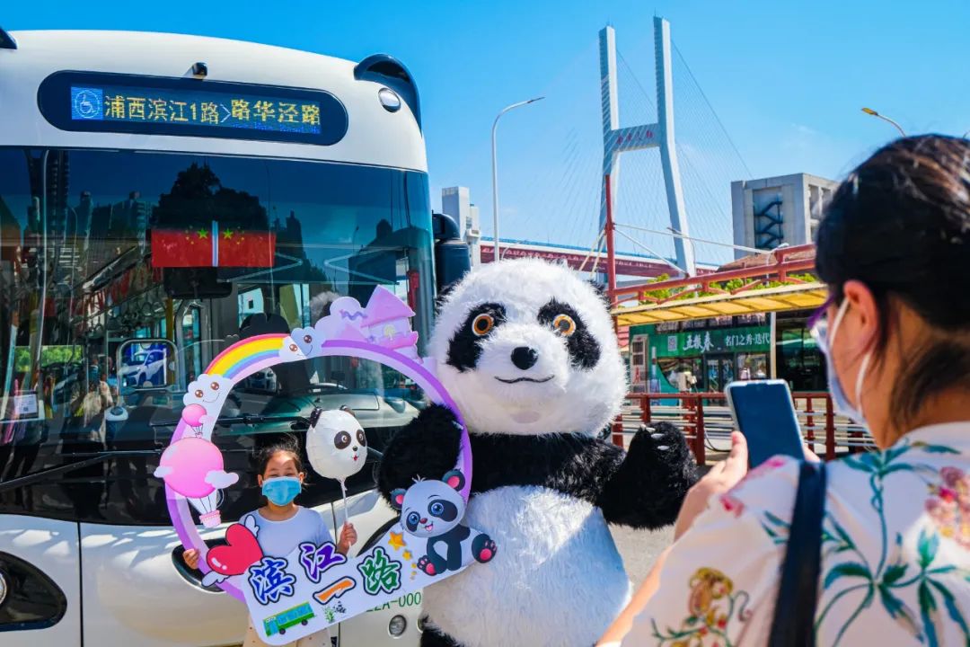 2021年10月4日国庆期间,可爱的大熊猫吉祥物在“网红线路”浦西滨江1路终点站与小朋友拍照留念,并介绍途经景点