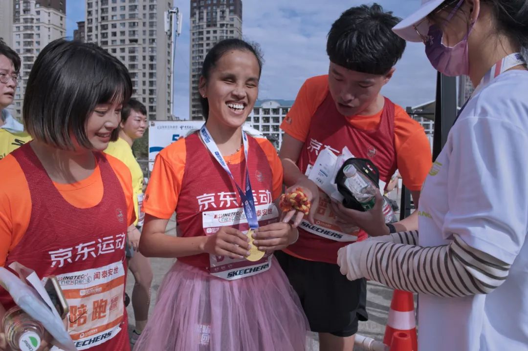 2021年10月17日上海10公里精英赛在普陀区举行。视觉障碍者李小姐在“黑暗跑团”公益陪跑组织的伴随下顺利完成赛事
